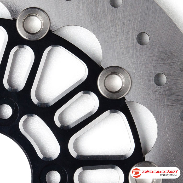 I nostri dischi semi-flottanti per Custom sono studiati e progettati per aumentare la coppia frenante e la maneggevolezza dell’avantreno, la resistenza a stress termomeccanici prolungati e la dispersione del calore generato dalla frenata sopratutto in utilizzi estremi anche per grosse Touring e Cruiser. Più grip in frenata maggiore prontezza e minor peso maggiore maneggevolezza quindi migliore guidabilità. I nostri dischi flottanti sono composti da: fascia frenante ricavata da lastre di acciaio AISI420 tagliate al laser e trattate termicamente, successivamente forata e mozzetto ricavato dal pieno di Ergal 7075, lavorato a CNC. La parte interna viene anodizzata nera oppure lucidata a specchio. In alternativa abbiamo il Night Brake dal look accattivante che viene anodizzato e poi ripreso di fresa sui bordi di alleggerimento per dare un profilo alluminio vivo. Fascia e mozzetto sono uniti da 10 nottolini in acciaio montati e ribattuti in modo che con le vibrazioni della moto non influenzino la frenata.