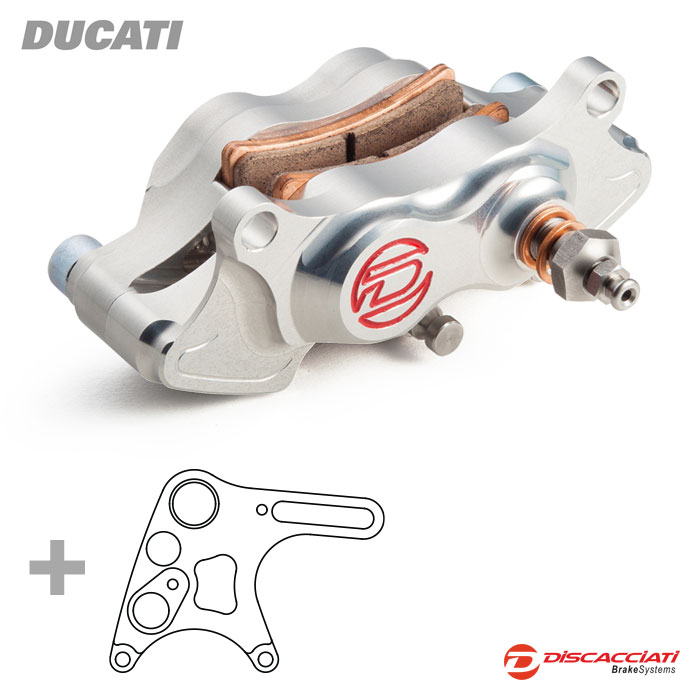 Pinza e supporto sono il Ergal 7075 interamente ricavati dal pieno tramite lavorazioni CNC e anodizzati. La pinza è corredata di pastiglie.