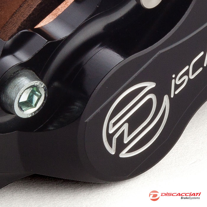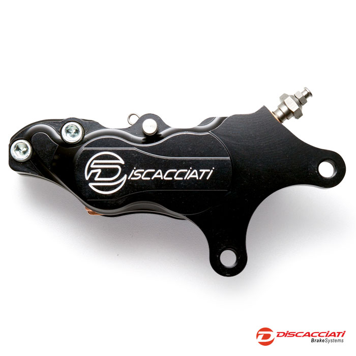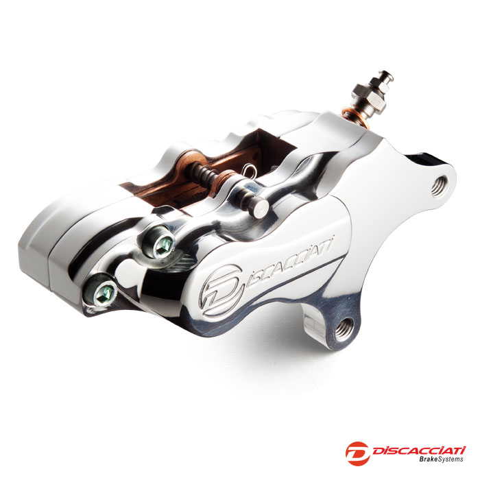 Pinza 4-pistoni specifica per Harley Davidson fino al 1999. Ad attacco diretto, con disco Ø330mm. Destra. Interamente ricavata da barre di Ergal 7075 con pistoni in alluminio trattati con ossidazione dura, guarnizioni racing, vite spurgo in acciaio. Anodizzata nera o lucidata a specchio.