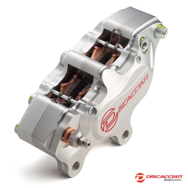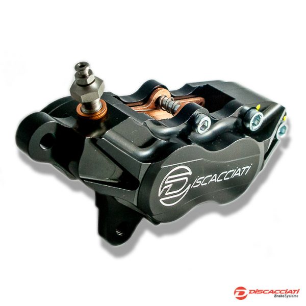Pinza 4-pistoni attacco radiale interasse 108mm. Destra. Interamente ricavata da barre di Ergal 7075 con pistoni in alluminio trattati con ossidazione dura, guarnizioni racing, vite spurgo in acciaio. Anodizzata
