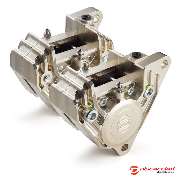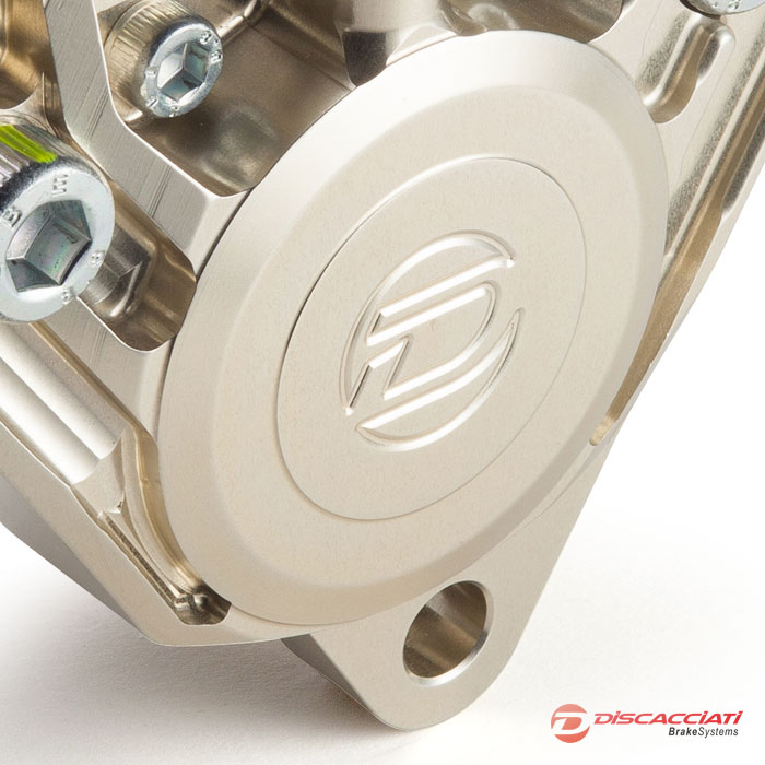 Pinza assiale 2-pistoni interasse 108mm. Sinistra. Interamente ricavata da barre di Ergal 7075 con pistoni in alluminio trattati con ossidazione dura, guarnizioni racing, vite spurgo in acciaio. Anodizzata champagne. Pastiglie Newfren FD0044BT. Peso pinza senza pastiglie Kg 0,950