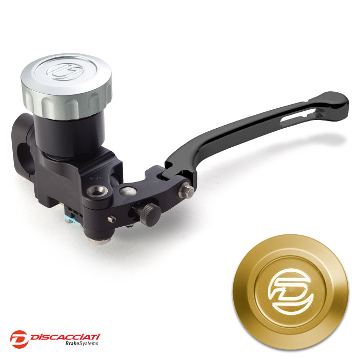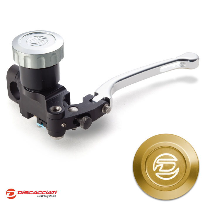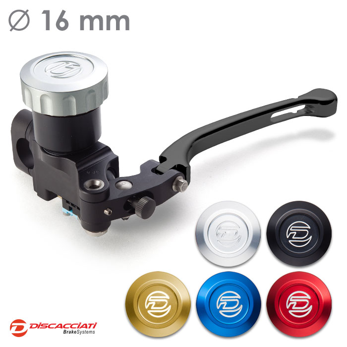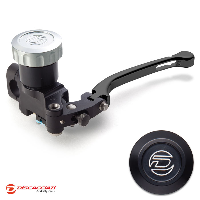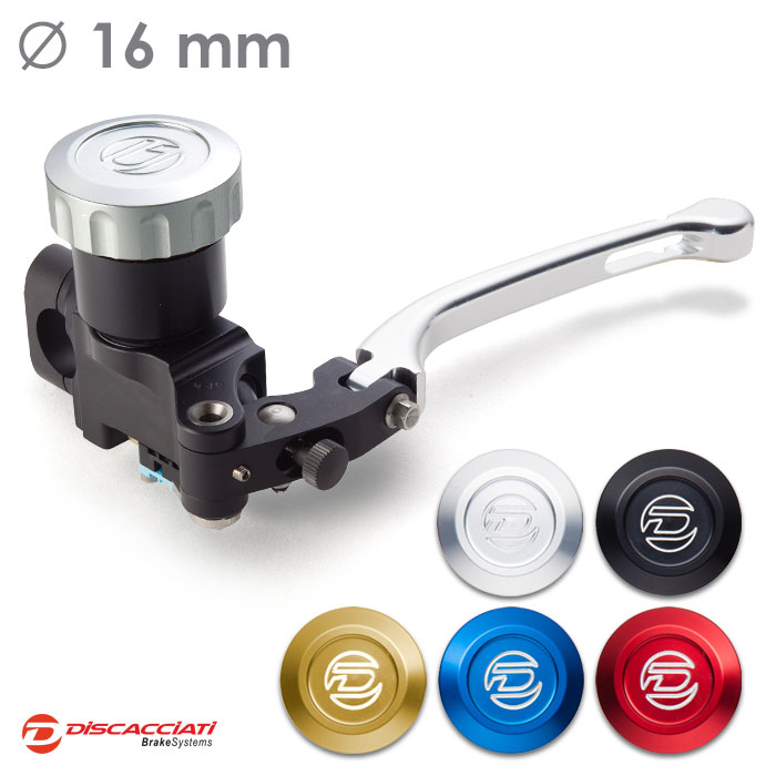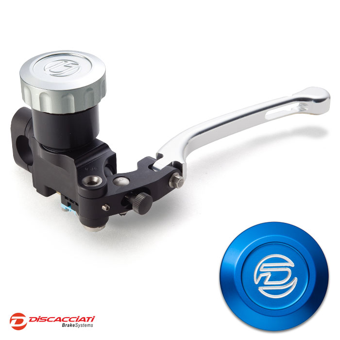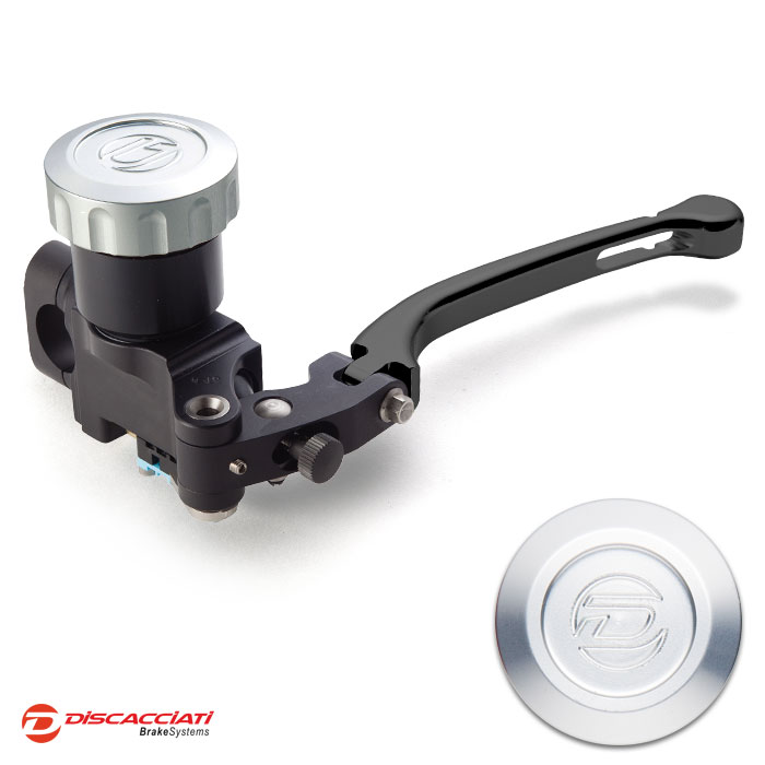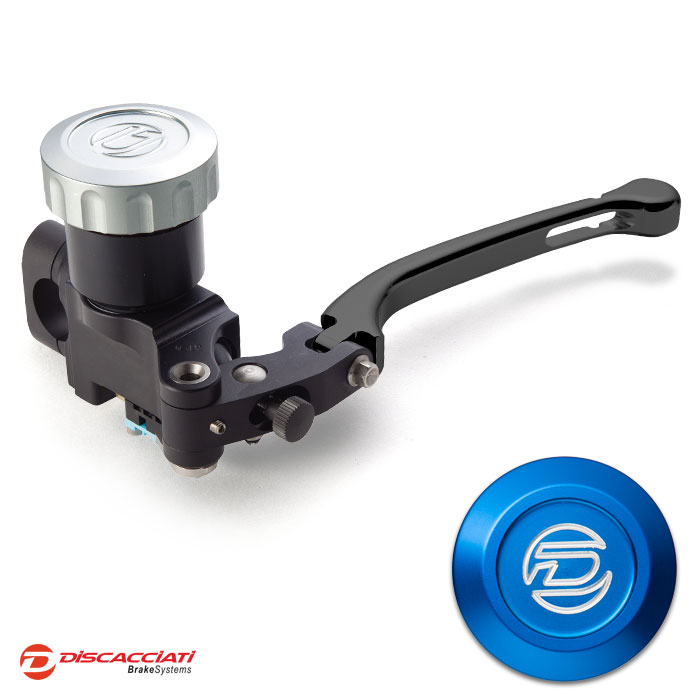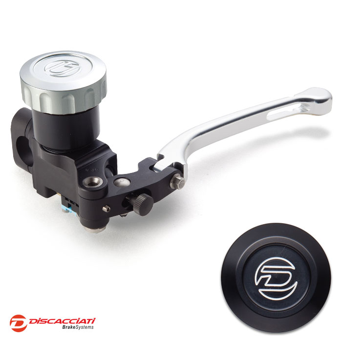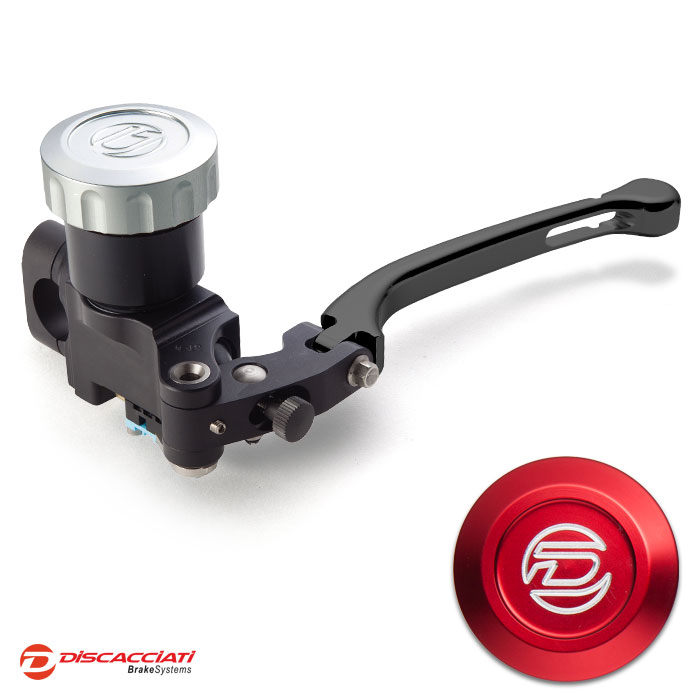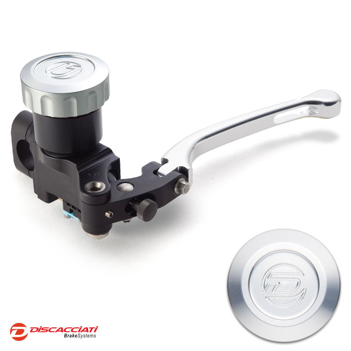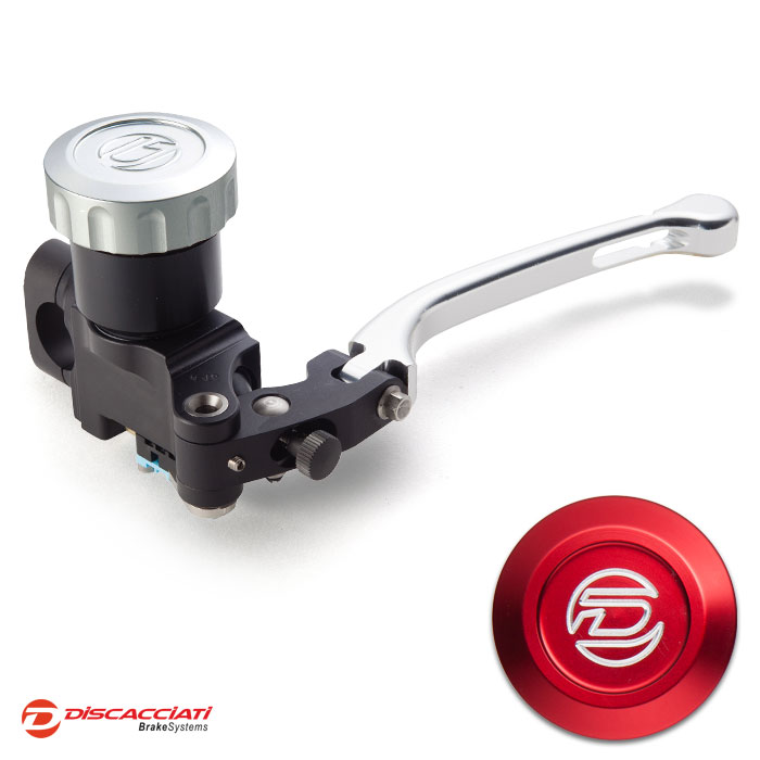 Tappo serbatoio in alluminio ricavato dal pieno ed anodizzato. Corpo pompa interamente ricavato da barre di alluminio, lavorato a CNC con pistone in alluminio e guarnizioni racing. Leva regolabile.